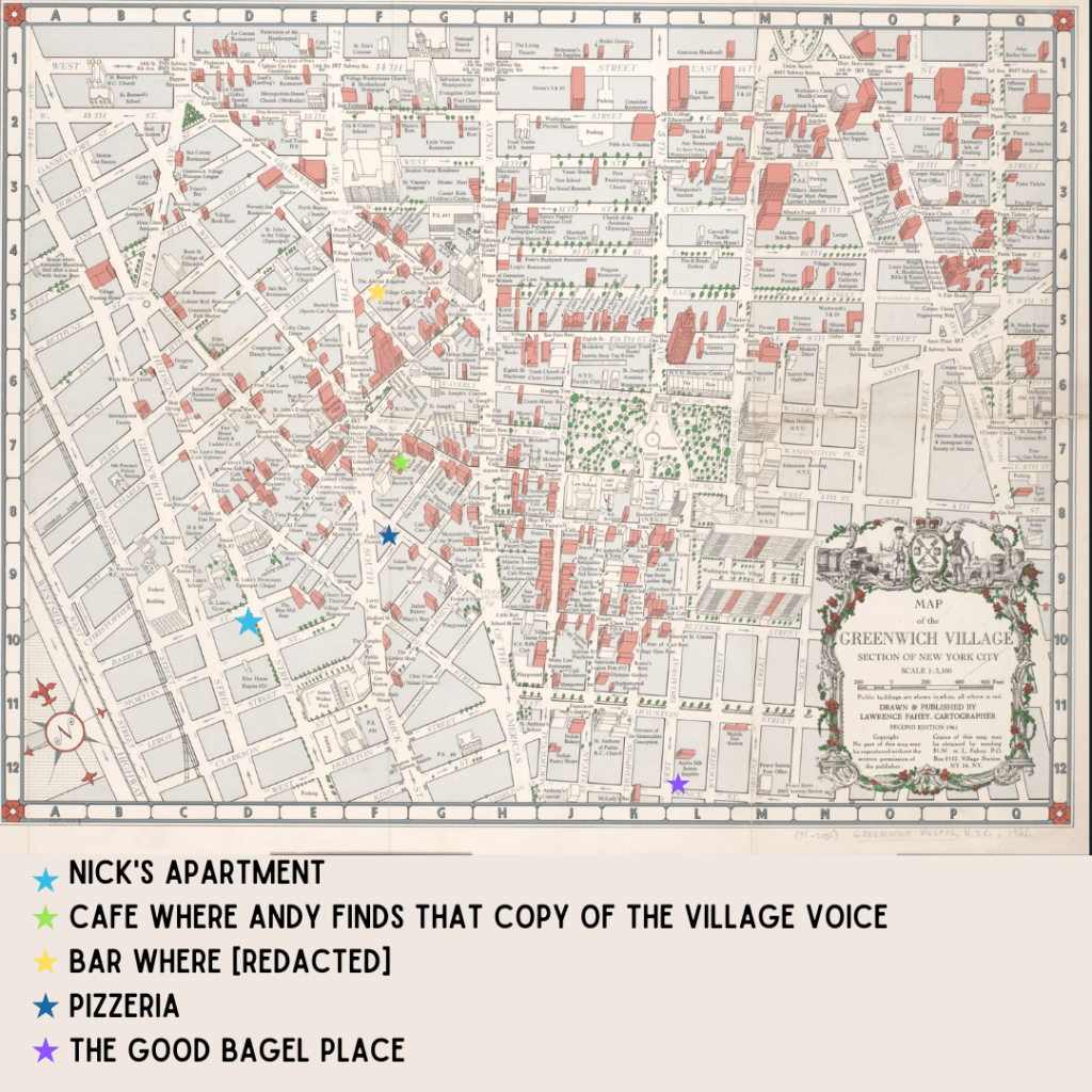 I’ve labeled some of the major locations, and if you look closely you can see other places that feature in the book–Italian bakeries, a florist, a bookstore, etc. A couple of places that figure in queer history are also on the map, including Julius’ and Stonewall. The Women’s House of Detention is also there.